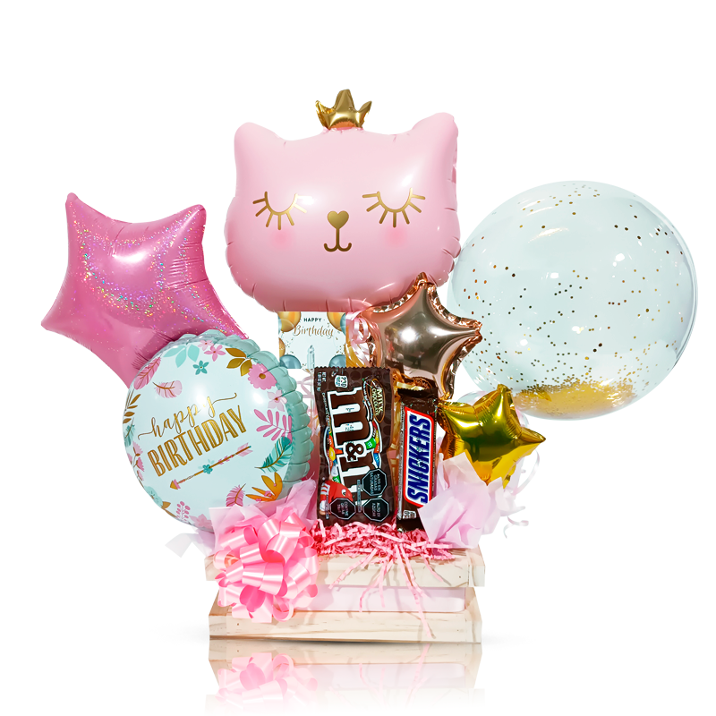 - 1 Globo metálico, en forma de gato 14″ (33cm aprox.).